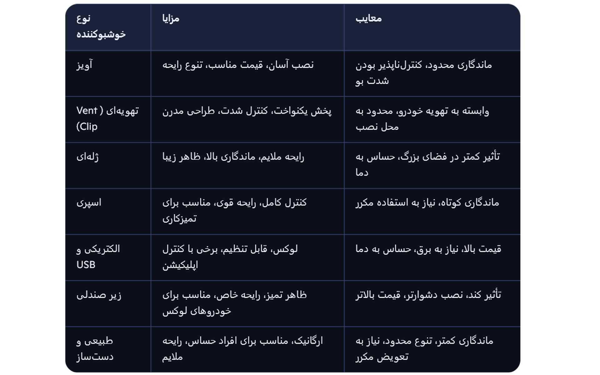 خوشبوکنندههای خودرو بر اساس شکل، عملکرد و محل نصب به دستههای مختلفی تقسیم میشن. هر نوع ویژگیها، مزایا و محدودیتهای خاص خودش رو داره:
