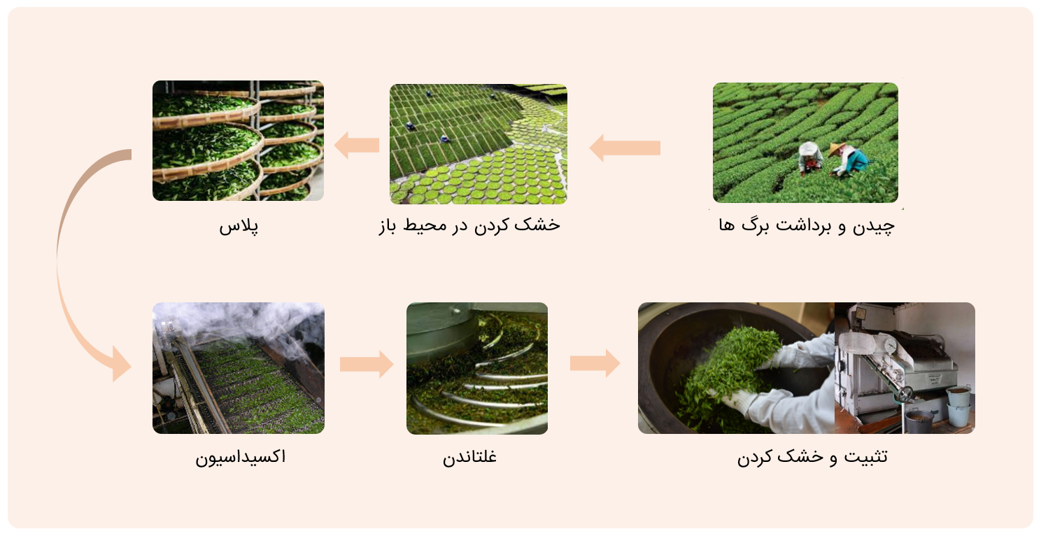 پس از برداشت، برگهای چای مراحل زیر را طی میکنند: