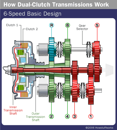 DCT ترکیبی از گیربکس دستی و اتوماتیک است. این گیربکس دارای دو کلاچ مجزا است: