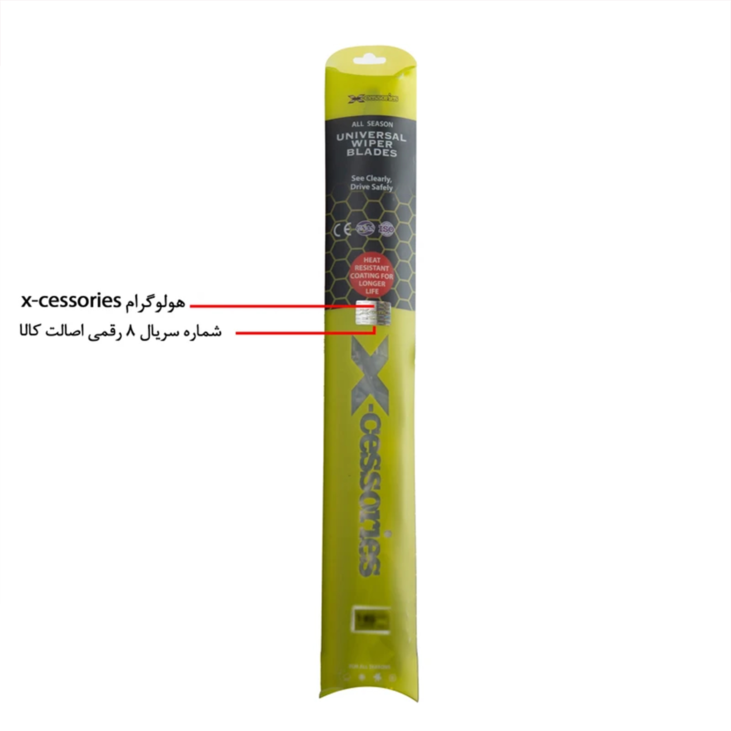 این محصول در اتصال قسمت بالایی و تیغه از 6 ناحیه به یکدیگر متصل شده اند که این باعث می گردد عملکرد بالایی بر روی شیشه و پاک کردن آن داشته باشد . عمر بالا و زیبایی محصول نیز از مواردی هستند که این تیغه را از سایر رقبا متمایز نموده است. پس از اولین استفاده کیفیت و کارایی محصول قابل مشاهده می باشد. بدنه اصلاح شده و حالت آیرودینامیکی و همچنین سیلیکون با کیفیت استفاده شده در این تیغه برف پاک کن باعث شده این تیغه عملکرد بهتری نسبت به سایز تیغه ها داشته باشد. عمر طولانی تر از سایر انواع تیغه ها باعث شده این نوع تیغه جایگزین مناسبی برای تیغه های معمولی باشد. این تیغه برف پاک کن دارای استاندارد CE اروپا ، استانداردهای ISO گواهی تایید صلاحیت آزمایشگاهی CNAS می باشد. لطفا قبل از خرید سایز تیغه ذکر شده در بخش مشخصات و اندازه گیری تیغه های خودرو خودتان اقدام فرمایید. برای اطمینان از خرید محصول اصلی ایکسسوری ، روی بسته بندی ارسالی هولوگرام ایکسسوری نصب گردیده که دارای شماره سریال اختصاصی 8 رقمی می باشد. لطفا برای اطمینان از سایز محصول به توضیحات در بخش مدل خودرو و ابعاد تیغه ها توجه فرمایید.