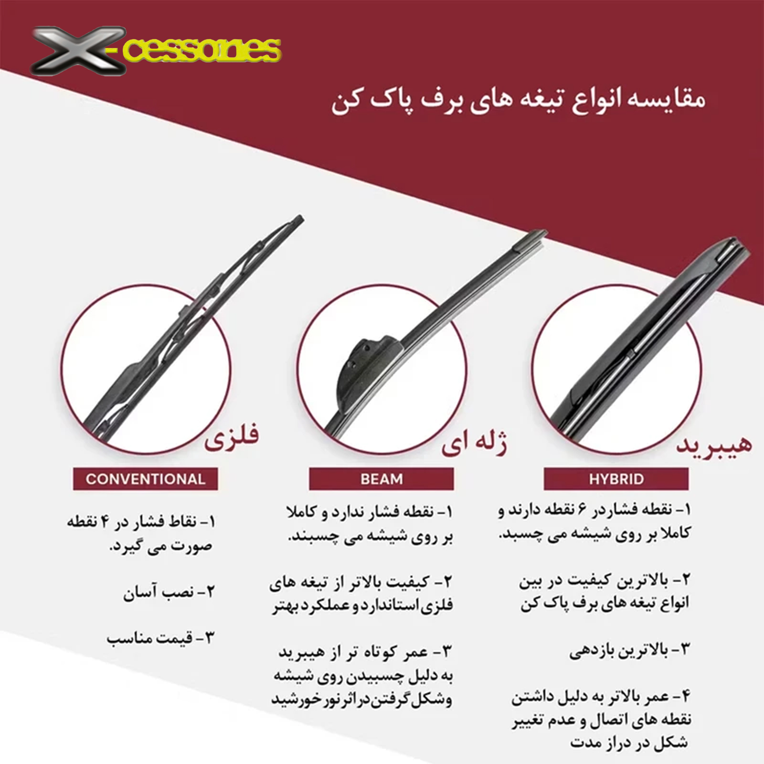 در مورد ویژگیهای تیغه برف پاک می توان گفت بهترین تیغه، علاوه بر داشتن عمر بالا، باید شیشه را به خوبی و به شکل کاملی تمیز کند و در کنار این تمیزی، هیچ سر و صدایی ایجاد نکند. فروشگاه های سنتی و آنلاین زیادی در بازار وجود دارند که تیغه برف پاک کن می فروشند، پس باید موقع “خرید تیغه برف پاک کن“، دقت لازم را داشته باشید تا یک جنس اصل بخرید؛ چون مدل های تقلبی زیادی در بازار وجود دارد که خیلی زود خراب می شوند و حتی شاید باعث خط و خش شیشه خودرو شما بشود. جنس لاستیک تیغه برف پاک کن از جنس لاستیک یا از جنس ژله و یا هیبریدی است که انتخاب آن به عهده شما و با سلیقه شما است؛ ولی مدل های هیبریدی علاوه بر طول عمر بیشتر نسبت به سایر نمونه ها ، در برابر رطوبت و آب زدایی، قدرت تمیز کردن زیاد و چسبندگی عالی دارند. این محصول ایکسسوری نیز هیبریدی می باشد و تمامی ویژگیهای بالا را در خود جای داده است .
