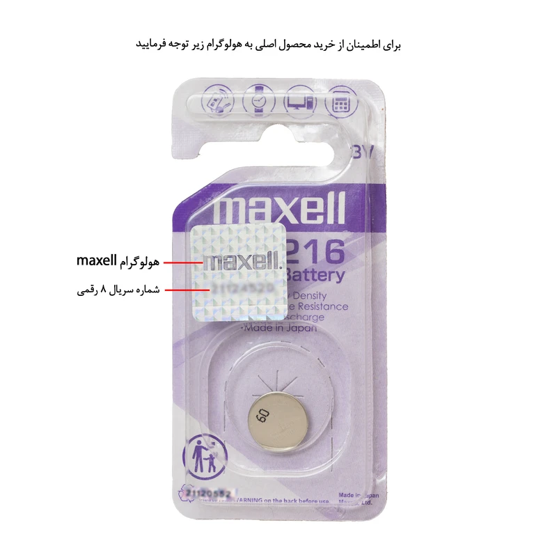 یکی از مهمترین دلیل خرید باتری سکه ای مکسل مدل CR1216 کیفیت، توان واقعی، ماندگاری و عملکرد باتری اصلی می باشد. از همین رو شرکت فیلیپس برای تشخیص محصول اصل از غیر اصل، اقدام به نصب هولوگرام با شماره سریال 8 رقمی بر روی بسته بندی باتری نموده است که در زمان خرید برای اطمینان از اصل بودن باتری به هولوگرام که تصویر آن در سایت موجود است توجه فرمایید. از ویژگی های باتری سکه ای مکسل مدل CR-1216 می توان به تکنولوژی جهت ساخت با استفاده از مواد لیتیومی (باتری سکه ای لیتیومی) و 3 ولت جریان خروجی واقعی اشاره کرد. باتری لیتیومی سکه ای مکسل را می توانید به عنوان یک باطری سکه ای ژاپنی، با کیفیت ساخت بالا، جریان خروجی یکنواخت، ماندگاری در طولانی مدت و به دلیل مواد استفاده شده در ساخت در این نوع از باتری سکه ای به عنوان دوستدار محیط زیست، معرفی نمود.