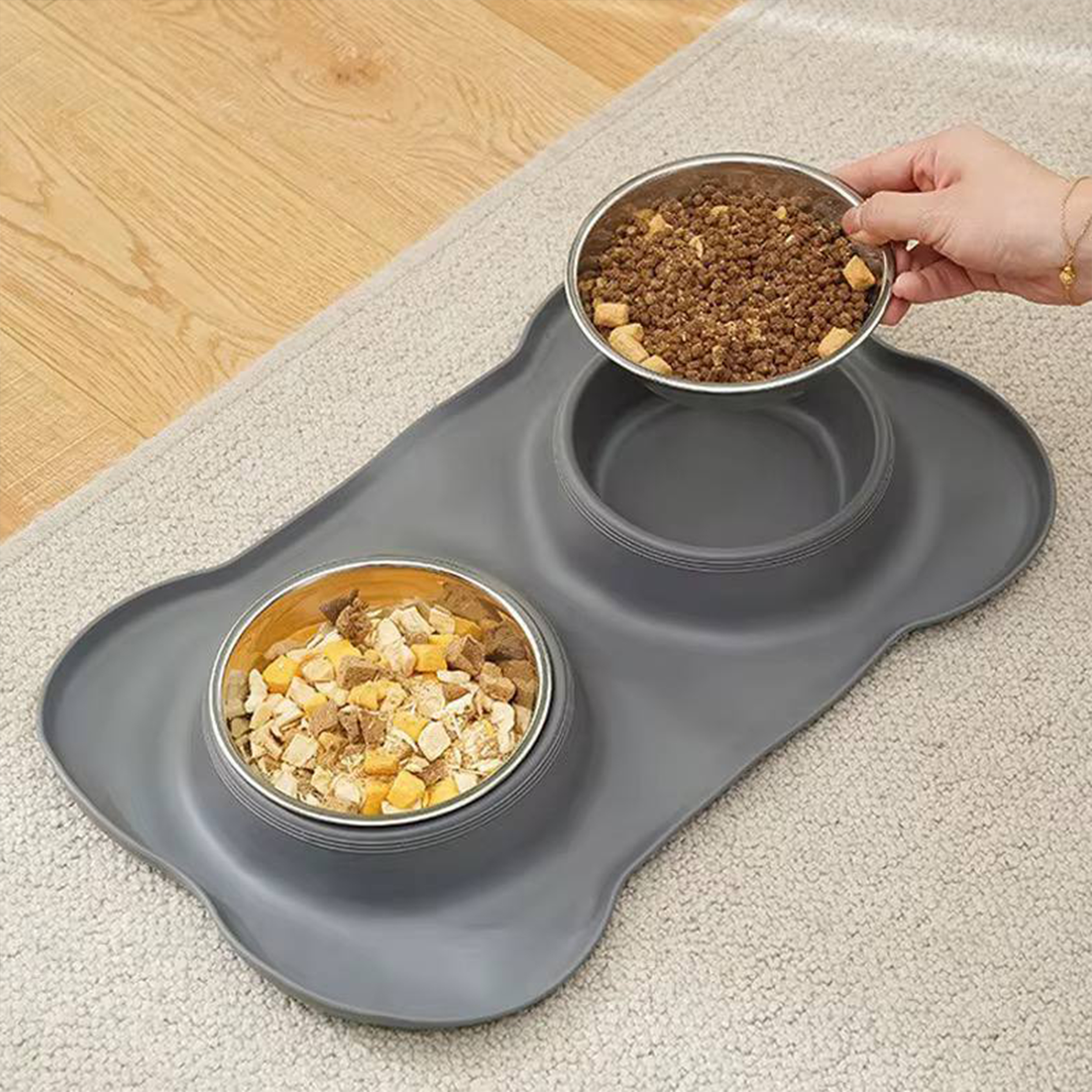 این ظرف در اولین نگاه متفاوت بودن را نشان می دهد . قسمت زیرین از جنس سیلیکون نرم می باشد که علاوه بر اینکه نگهدارنده ظروف استیل می باشد اگر غذا یا آب از کنار ظرف بریزد بر روی قسمت سیلیکونی می ریزد و زمین یا فرش کثیف نمی شود . برای حمل و نقل می توانید محصول را جمع کنید و درون کیف بگذارید . دو عدد کاسه استیل ضد زنگ نیز بر روی محصول قرار دارد که می توانید سالها از آنها استفاده کنید و همچنان مانند روز اول سالم و تمیز بماند . برای اطمینان از خرید محصول اصلی به هولوگرام MK در کف محصول که دارای شماره سریال 8 رقمی می باشد توجه فرمایید.