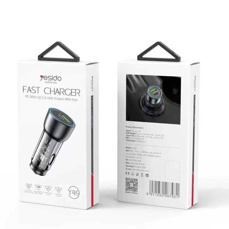 شارژر فندکی فست شارژ یسیدو Yesido Fast Charger Y49 مجهز به فناوری QC3.0 و PD میباشد که مجهز به 2 پورت خروجی تایپسی و USB است توان خروجی ماکسیمم کل : 48 وات است و PD30W میباشد