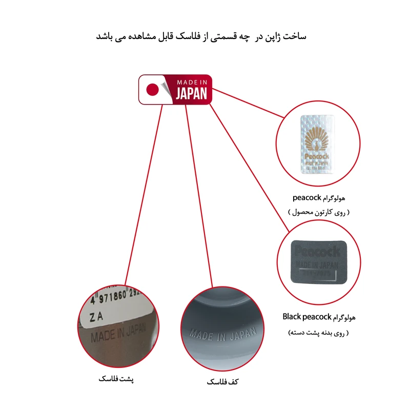 رای تحقیق درباره کیفیت این محصول بهتر است سراغ پدربزرگ و مادربزرگ هایمان برویم تا از گذشته و حضور این محصول در خاطراتشان برایمان تعریف کنند. ساخت ژاپن، این کلمه ما را همیشه از کیفیت بالای یک محصول آگاه می سازد، فلاسک پیکوک نیز بیش از 70 سال است که در کشور ژاپن تولید و به بازارهای جهانی عرضه می گردد. Made in Japan در نقاط مختلف محصول حک شده و قابل روئیت می باشد. فلاسک پیش روی شما از بدنه استیل با پوشش رنگی تولید گردیده که باعث می گردد علاوه بر طول عمر بیشتر زیبایی آن را دوچندان نماید. مخزن این فلاسک از با کیفیت ترین شیشه کشور ژاپن ساخته شده است .